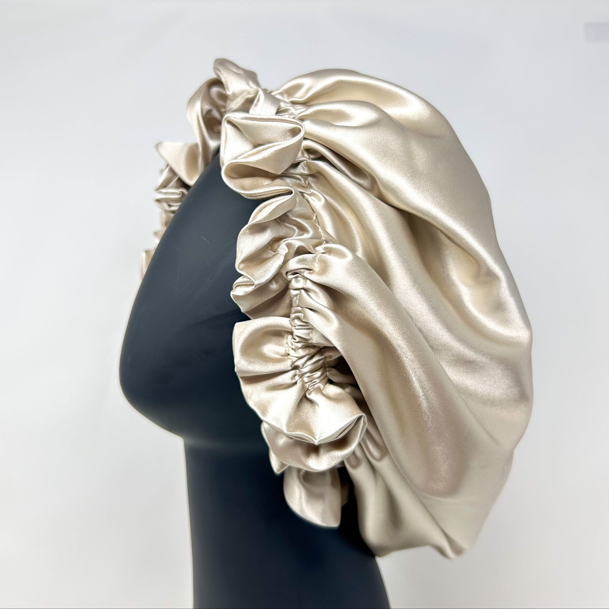 Elevate your nighttime hair routine with our handmade in Canada silk bonnet and wake up to silky, nourished, frizz-free hair every morning.